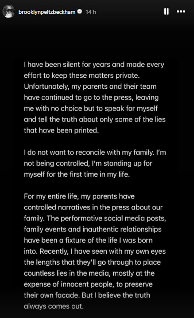 "He estado en silencio durante años y he hecho todo lo posible para mantener estos asuntos privados", comenzaba escribiendo el joven de 26 años en sus historias de Instagram ante sus más de 16 millones de seguidores. Brooklyn reconocía que "desafortunadamente, sus padres y su equipo han acudido a los medios" en repetidas ocasiones, "dejándole sin otra opción" que contar "la verdad sobre solo algunas de las mentiras" que se han publicado en los últimos meses.