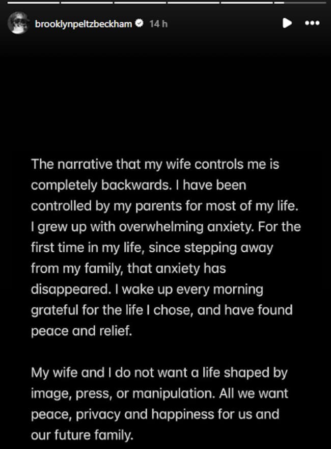 Asimismo, Brooklyn ha aclarado que la idea de que su esposa controla su narrativa es mentira, reiterando que los que han controlado su vida han sido sus padres durante años, lo que le forzó a crecer con una "ansiedad abrumadora". "Por primera vez en mi vida, desde que me alejé de mi familia, esa ansiedad ha desaparecido. Me despierto cada mañana agradecido por la vida que elegí y he encontrado paz y alivio", concluía.