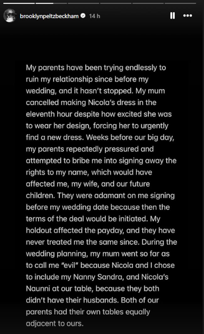 También alegó que su esposa fue "faltada al respeto" por su familia y que no fue invitada a la fiesta del 50º cumpleaños de David Beckham. Brooklyn sostiene que fueron "rechazados durante una semana mientras esperábamos en nuestra habitación de hotel tratando de planificar un momento de calidad con él". En esa misma línea, confesaba que su padre finalmente accedió al encuentro, pero con la condición de que Nicola no acudiese. Una respuesta que ha calificado como "una bofetada en la cara".
