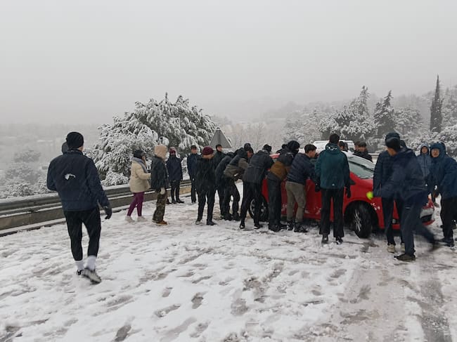 Varias personas tratan de mover un vehículo atravesado en la carretera M-519 a la altura de Galapagar, en el que la borrasca Kristin deja nieve en la región de Madrid. / Álvaro Blanco (EFE)