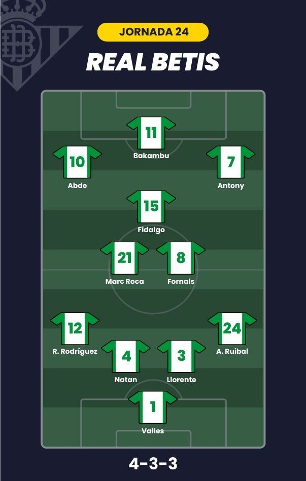 - Real Betis: Valles; Ruibal, Llorente, Natan, Ricardo Rodríguez; Marc Roca, Fornals, Fidalgo; Antony, Abde y Bakambú