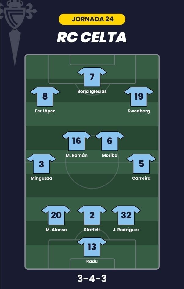 - Celta de Vigo: Radu; Carreira, Javi Rodríguez, Starfelt, Marcos Alonso, Mingueza; Román, Ilaix Moriba; Fer López, Swedberg y Borja Iglesias