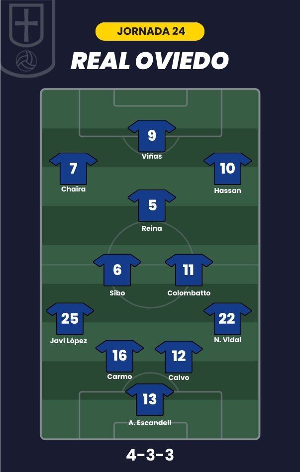 - Real Oviedo: Aarón; Nacho Vidal, Calvo, Carmo, Javi López; Colombatto, Sibo, Reina; Hassan, Chaira y Viñas