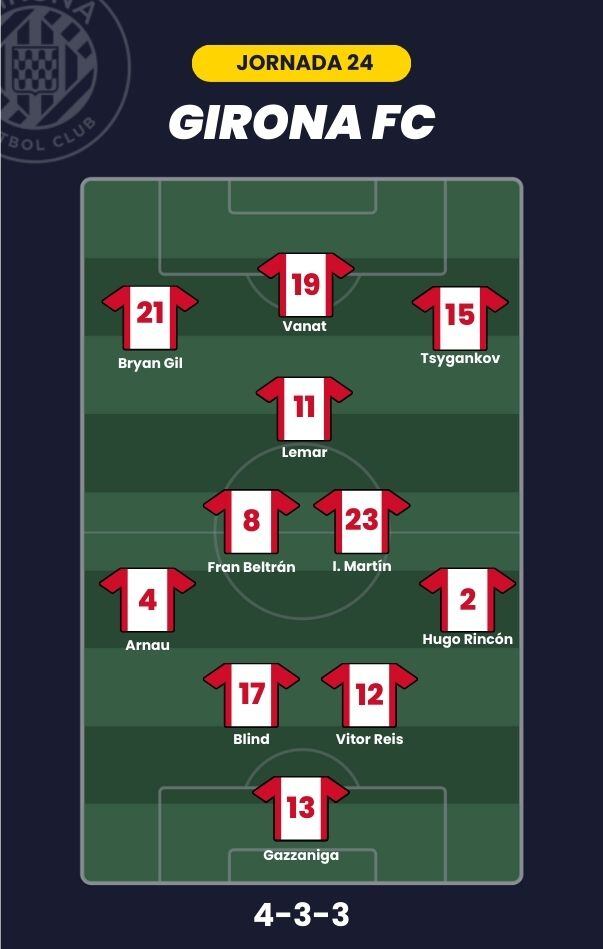 - Girona FC: Gazzaniga; Hugo Rincón, Vitor Reis, Blind, Arnau; Fran Beltrán, Iván Martín, Lemar; Tsygankov, Bryan Gil; y Vanat
