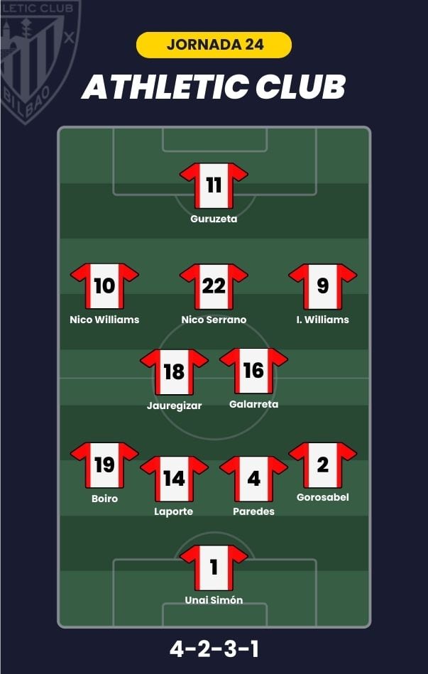 - Athletic Club: Unai Simón; Gorosabel, Paredes, Laporte, Boiro; De Galarreta, Jauregizar, Nico Serrano, Nico Williams; Iñaki Williams y Guruzeta