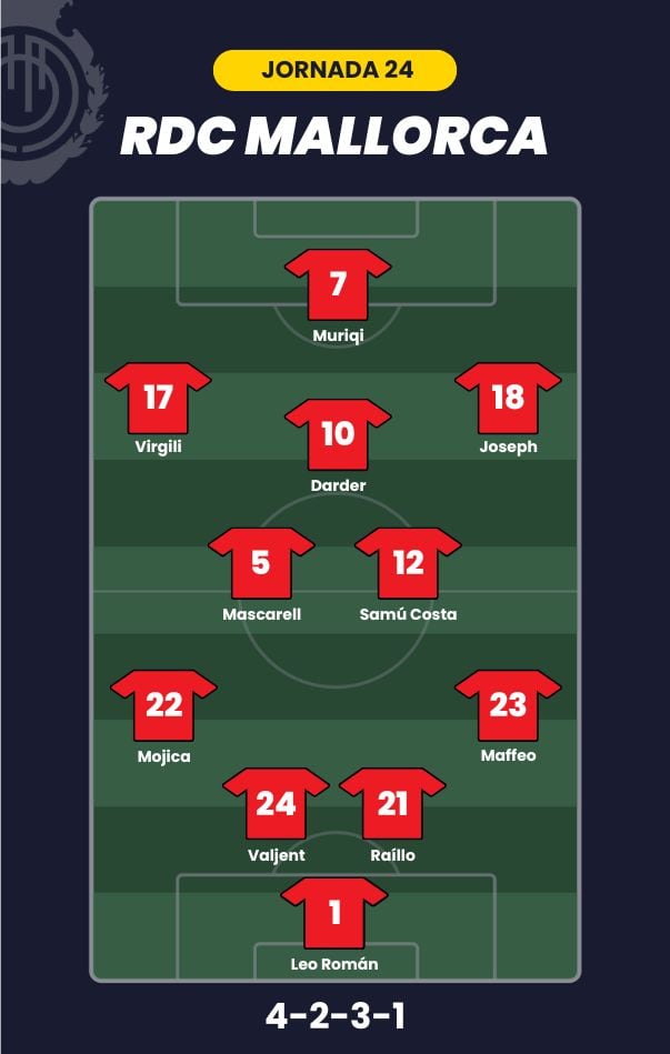 - RCD Mallorca: Leo Román; Maffeo, Valjent, Raíllo, Mojica; Mascarell, Samú Costa, Darder; Joseph, Virgili y Muriqi