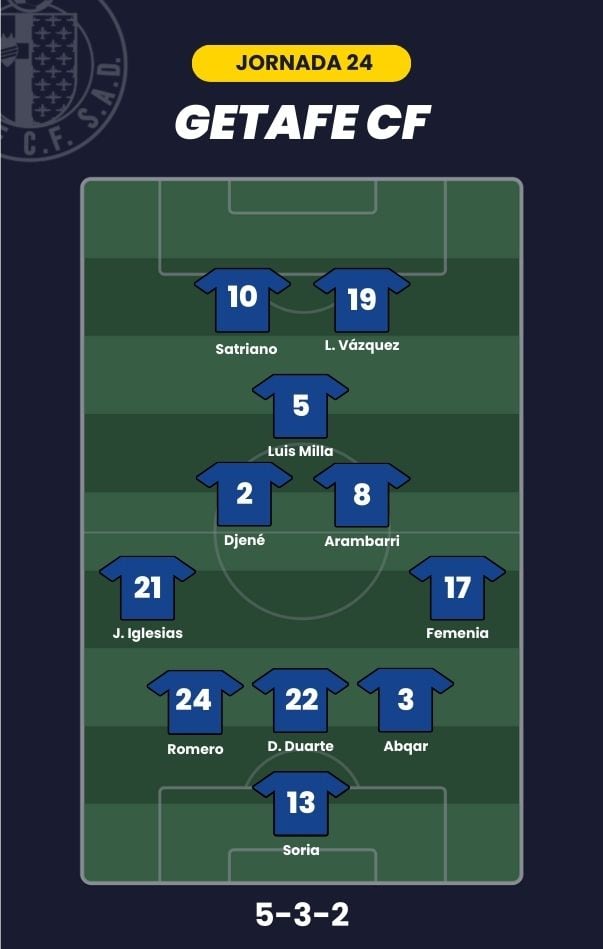 - Getafe CF: Soria; Femenia, Abqar, Domingos Duarte, Romero, Juan Iglesias; Djené, Arambarri, Luis Milla; Luis Vázquez y Satriano