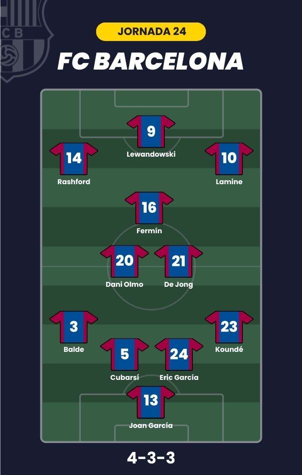 - FC Barcelona: Joan García; Koundé, Cubarsí, Eric García, Balde; De Jong, Fermín López, Dani Olmo; Lamine Yamal, Rashford y Lewandowski