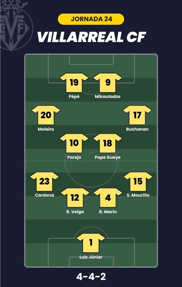 - Villarreal CF: Luiz Junior; Mouriño, Rafa Marín, Renato Veiga, Cardona; Pape Gueye, Parejo, Buchanan, Moleiro; Nicolas Pépé y Mikautadze