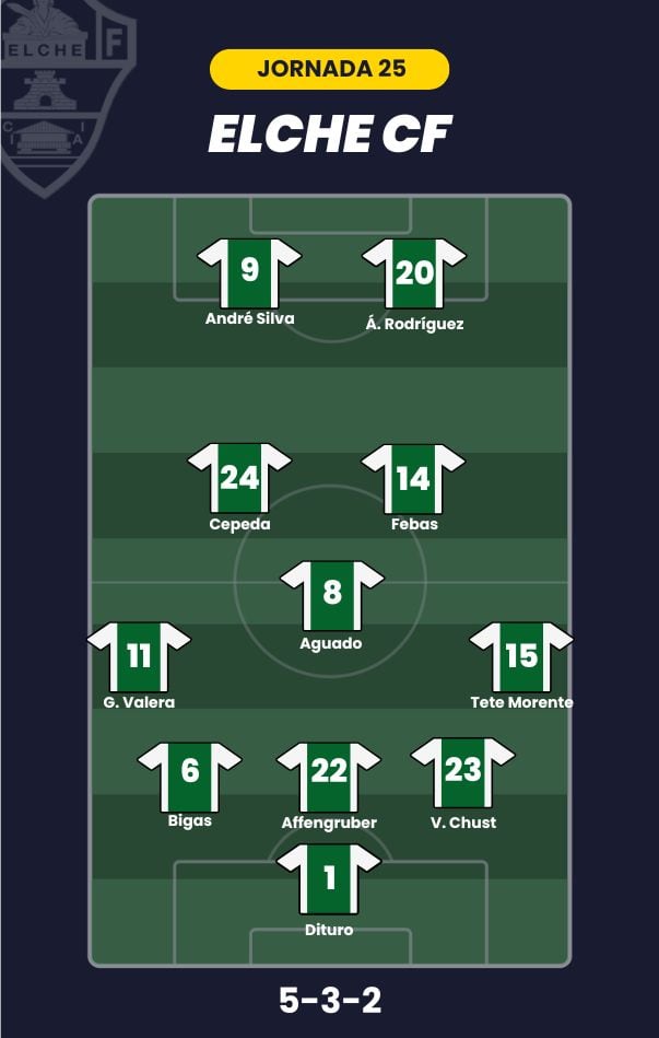 - Elche CF: Dituro; Tete Morente, Víctor Chust, Affengruber, Bigas, Germán Valera; Aguado, Cepeda, Febas; André Silva y Álvaro Rodríguez