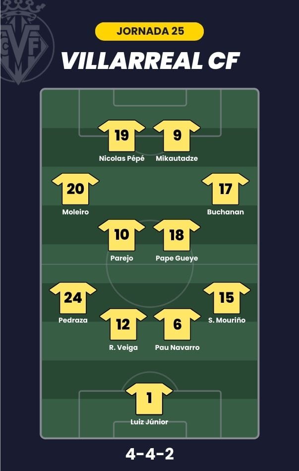 - Villarreal CF: Luiz Junior; Mouriño, Pau Navarro, Renato Veiga, Pedraza; Pape Gueye, Parejo, Buchanan, Moleiro; Nicolas Pépé y Mikautadze
