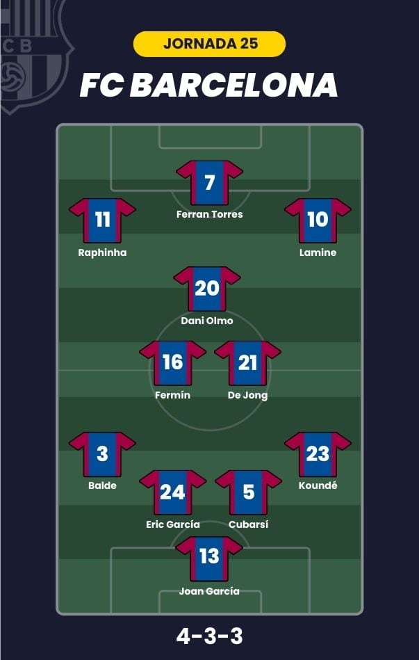 - FC Barcelona: Joan García; Koundé, Cubarsí, Eric García, Balde; De Jong, Fermín López, Dani Olmo; Lamine Yamal, Raphinha y Ferran Torres