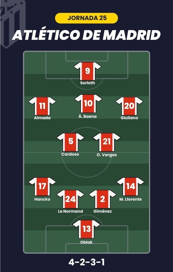 - Atlético de Madrid: Oblak; Marcos Llorente, Giménez, Le Normand, Hancko; Vargas, Johnny Cardoso, Álex Baena; Giuliano, Almada y Sorloth