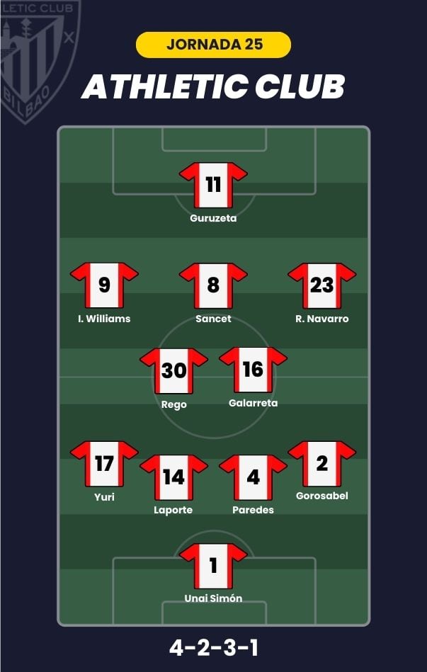 - Athletic Club: Unai Simón; Gorosabel, Paredes, Laporte, Yuri Berchiche; De Galarreta, Rego, Sancet, Robert Navarro, Iñaki Williams; y Guruzeta