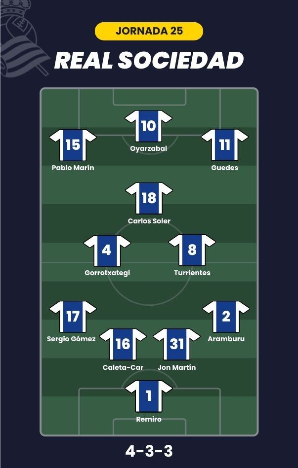 - Real Sociedad: Remiro; Aramburu, Jon Martín, Caleta-Car, Sergio Gómez; Turrientes, Gorrotxategi, Carlos Soler; Guedes, Pablo Marín y Oyarzabal