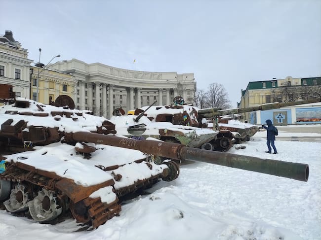Tanques rusos destruidos, en una plaza de Kiev. EFE/Marcel Gascón / Marcel Gascón (EFE)