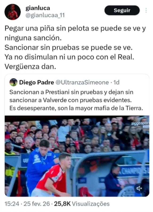 "Pegar una piña sin pelota se puede, se ve y ninguna sanción. Sancionar sin pruebas se puede, se ve. Ya no disimulan ni un poco con el Real. Vergüenza dan", había escrito en su cuenta de X. Lo hizo citando otro mensaje donde recordaba una jugada de Fede Valverde en la que no ve amonestación y que fue denunciada por el Benfica por "conducta violenta", pero la UEFA la desestimó. Poco después, eliminó el post de sus redes sociales.
