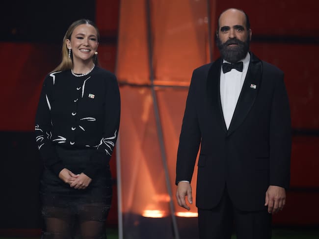 Los presentadores Rigoberta Bandini y Luis Tosar, durante la ceremonia de entrega de la 40 edición de los Premios Goya celebrada este sábado en el Auditorio Forum CCIB de Barcelona. / Alberto Estévez (EFE)