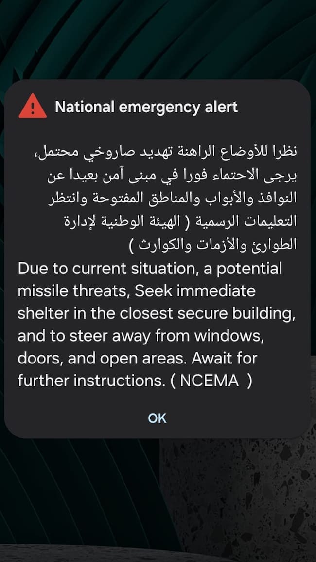 Este español asegura que en la zona donde él vive (la zona de Al Raja Beach) "no ha pasado nada" porque "la defensa aérea funciona a la perfección", pero la tensión llega porque se pasan "todo el día escuchando explosiones por todas partes". "No hay ningún impacto en los edificios a nuestro alrededor, ninguno tiene los cristales rotos, pero existe el peligro de los restos que caen del cielo de interceptaciones de misiles y de drones".