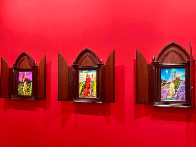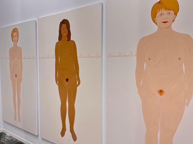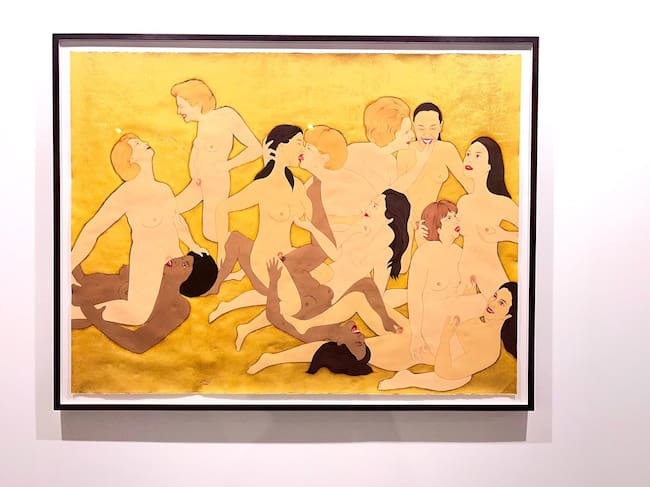 Caminando por los pasillos del pabellón 7 de IFEMA es difícil no fijarse en esa escena de sexo lésbico en el que uno identifica a algunas de las principales líderes mundiales de los últimos años, desde Margaret Thatcher a Angela Merkel, pasando por Ursula Von der Leyen, Kamala Harris o Hillary Clinton. Representadas sobre un fondo dorado, todas sonríen, se besan, se tocan y se acarician. Una orgía sexual que culmina la serie que ha titulado 'Pan, trabajo y libertad' (los derechos fundamentales que los talibanes niegan a las mujeres afganas, y que se ha convertido en el lema de su lucha) y que expone la galería franco-belga Eric Mouchet.