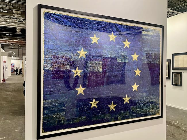 Sobre las migraciones y las personas que arriesgan su vida cruzando el Mediterráneo para encontrarse con unas fronteras cada vez más rígidas reflexiona en la galería Freijo la obra de Ramón Mateos (el mismo que firmó la cortina galvanizada sobre la que estaba sobreimpresa la cifra de ancianos fallecidos por COVID en las residencias de Madrid) 'Fortaleza europea', una manta isotérmica sobre la que está pintada en fondo azul la bandera de la Unión Europea.