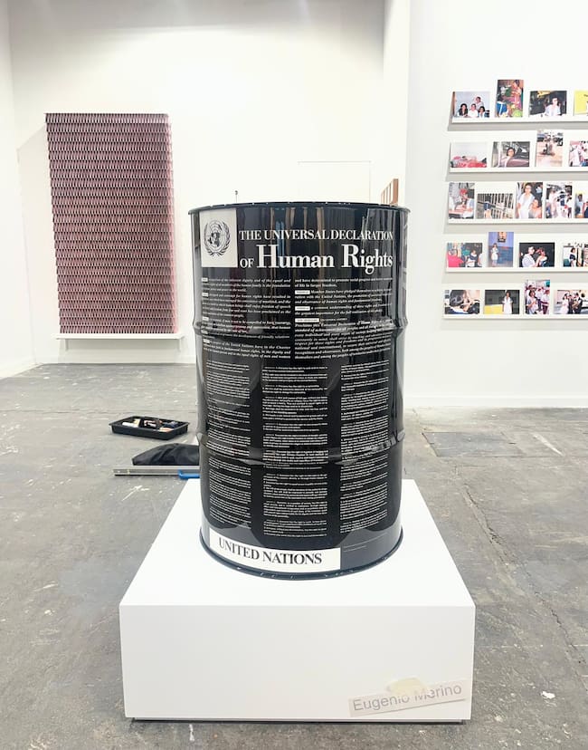 Barril de petróleo con la declaración universal de Derechos Humanos de Eugenio Merino