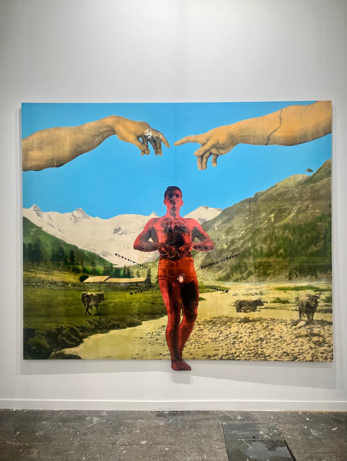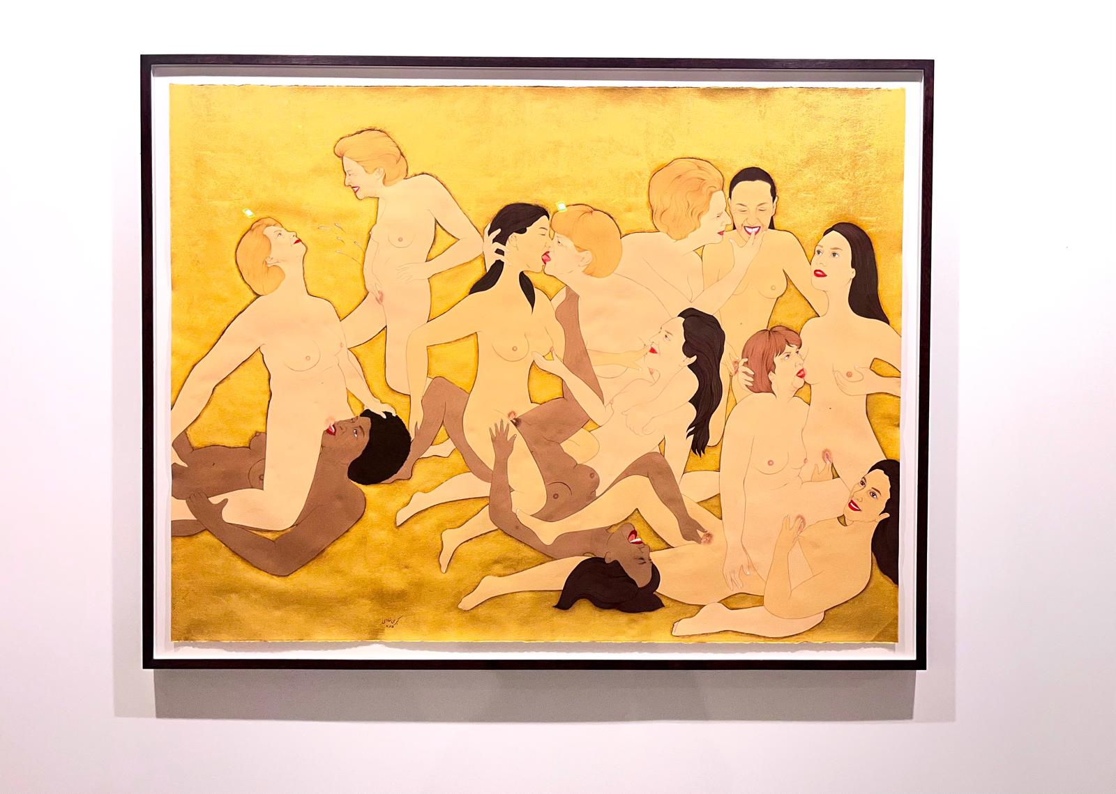 Caminando por los pasillos del pabellón 7 de IFEMA es difícil no fijarse en esa escena de sexo lésbico en el que uno identifica a algunas de las principales líderes mundiales de los últimos años, desde Margaret Thatcher a Angela Merkel, pasando por Ursula Von der Leyen, Kamala Harris o Hillary Clinton. Representadas sobre un fondo dorado, todas sonríen, se besan, se tocan y se acarician. Una orgía sexual que culmina la serie que ha titulado 'Pan, trabajo y libertad' (los derechos fundamentales que los talibanes niegan a las mujeres afganas, y que se ha convertido en el lema de su lucha) y que expone la galería franco-belga Eric Mouchet.