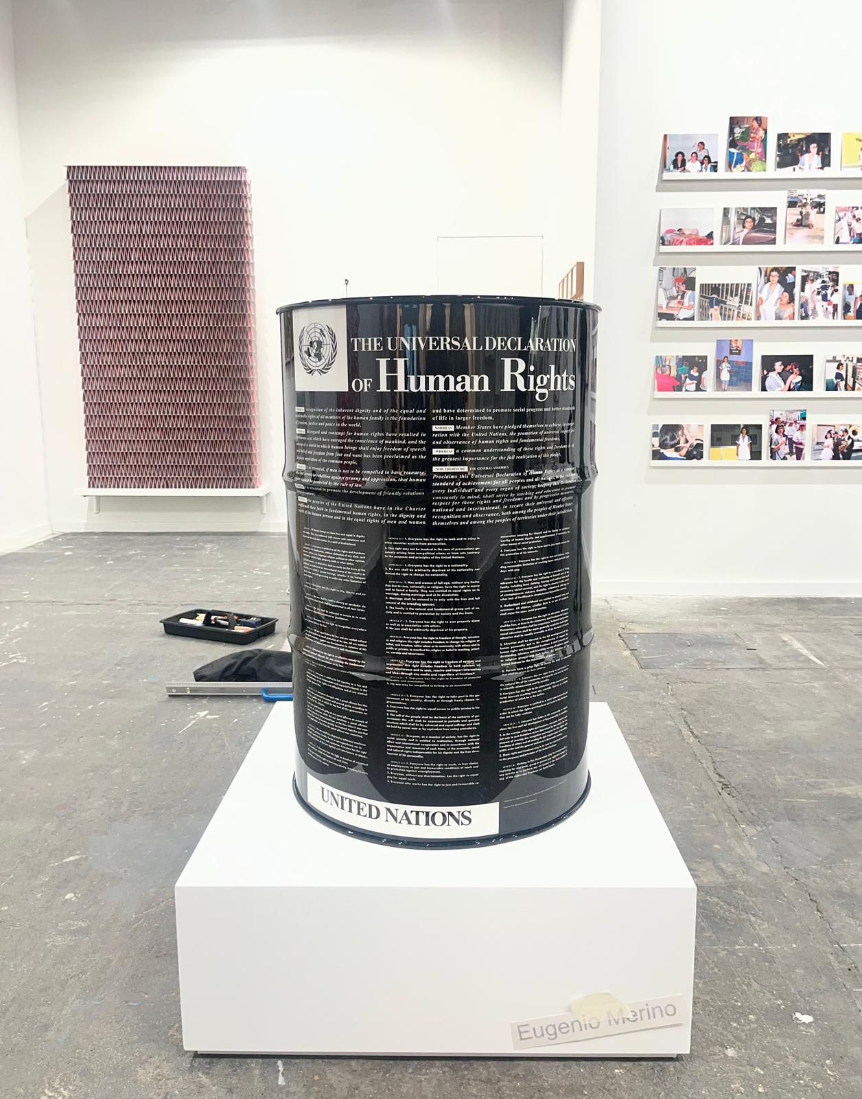 Barril de petróleo con la declaración universal de Derechos Humanos de Eugenio Merino