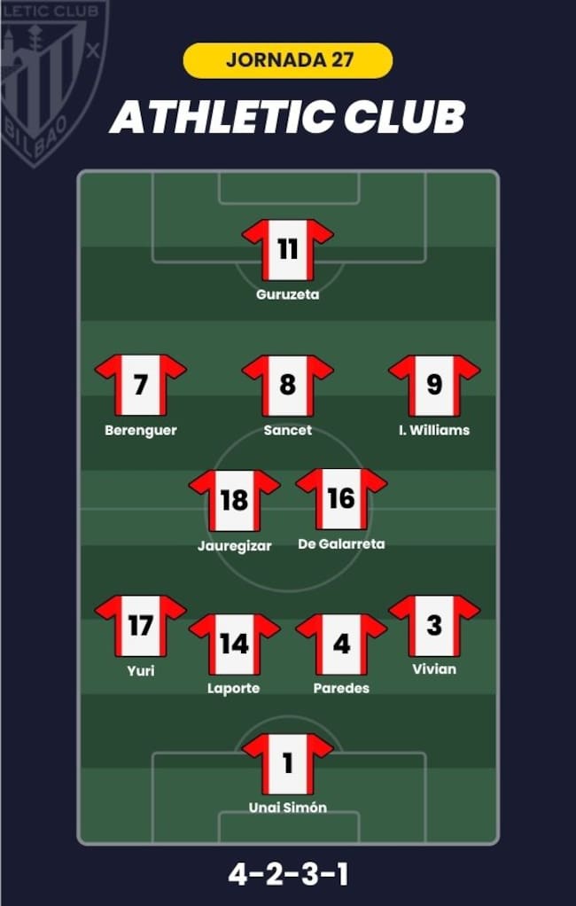 - Athletic Club: Unai Simón; Vivian, Paredes, Laporte, Yuri Berchiche; De Galarreta, Jauregizar, Sancet, Iñaki Williams, Berenguer; y Guruzeta
