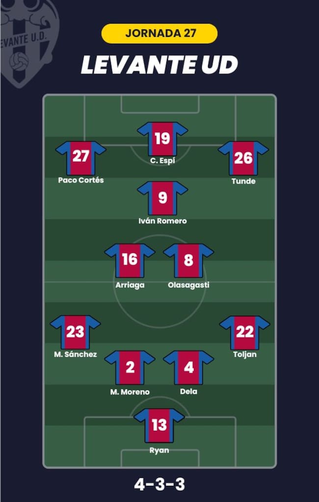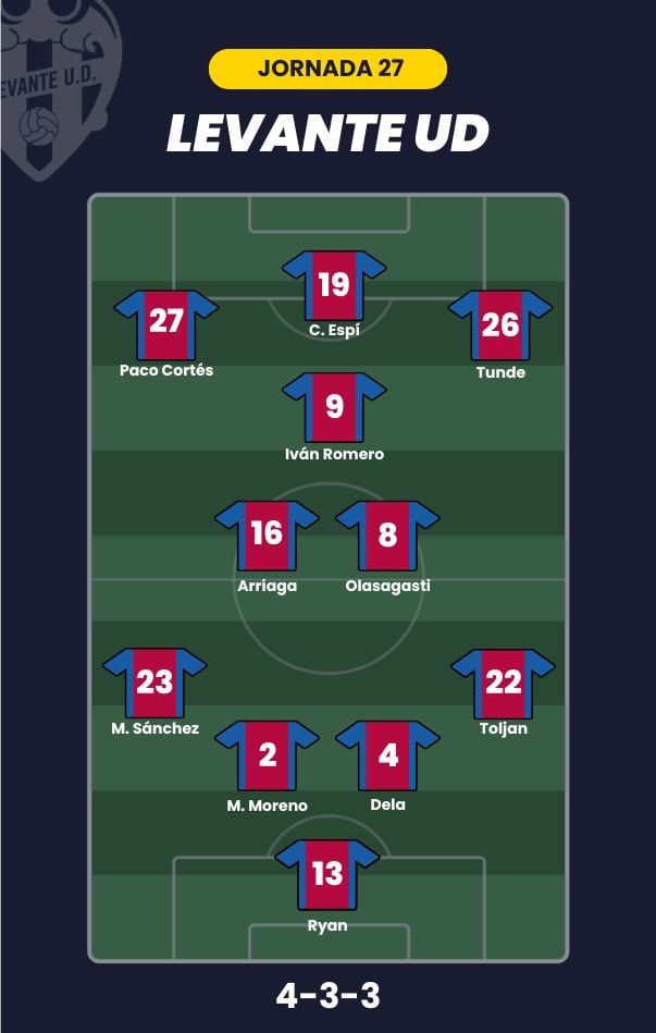 - Levante UD: Ryan; Toljan, Dela, Moreno, Manu Sánchez; Olasagasti, Arriaga, Iván Romero; Tunde, Paco Cortés y Carlos Espí