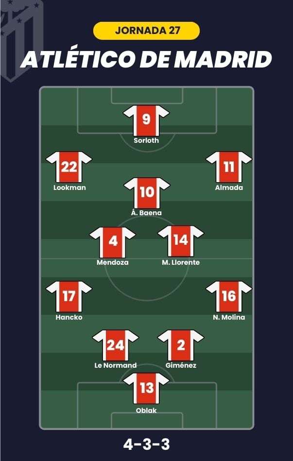 - Atlético de Madrid: Oblak; Nahuel Molina, Giménez, Le Normand, Hancko; Marcos Llorente, Mendoza, Baena; Almada, Lookman y Sorloth