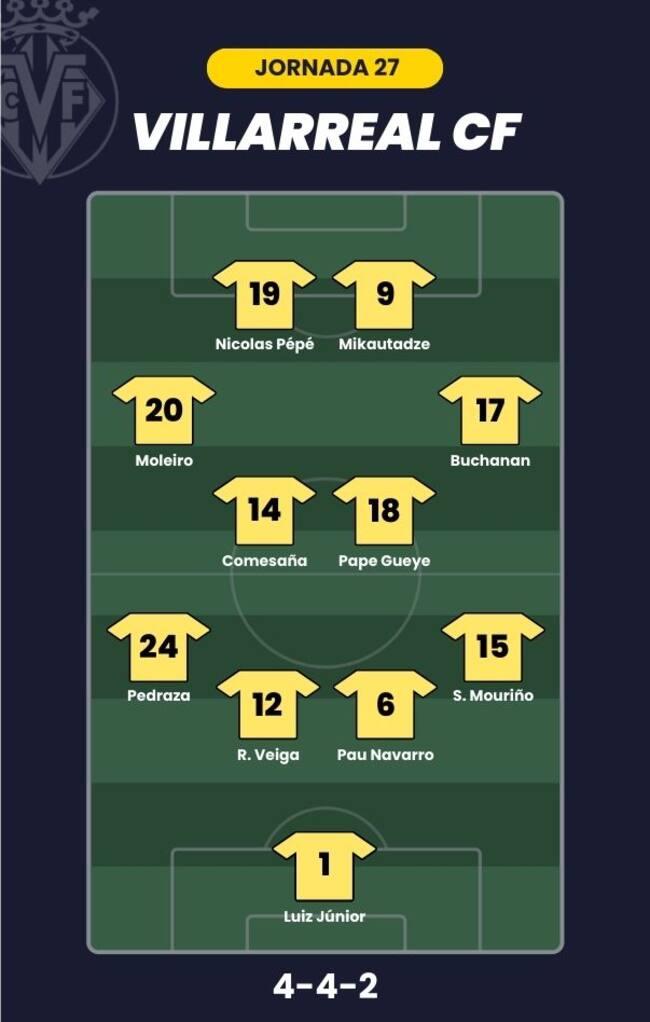 - Villarreal CF: Luiz Junior; Mouriño, Pau Navarro, Renato Veiga, Pedraza; Pape Gueye, Comesaña, Buchanan, Moleiro; Nicolas Pépé y Mikautadze