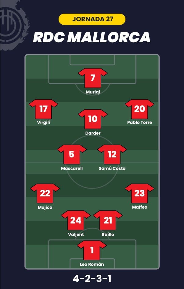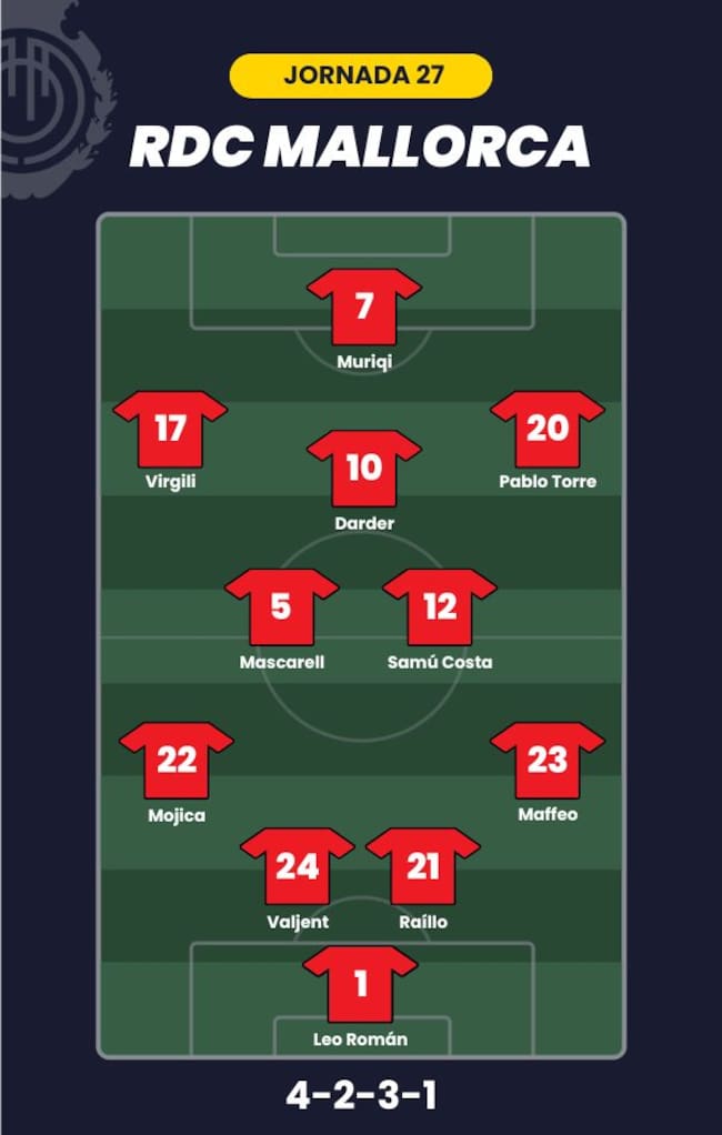 - RCD Mallorca: Leo Román; Maffeo, Valjent, Raíllo, Mojica; Mascarell, Samú Costa, Darder; Pablo Torre, Virgili y Muriqi