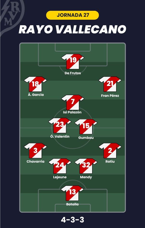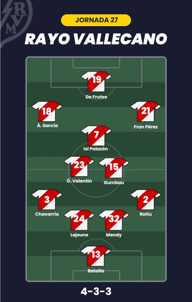 - Rayo Vallecano: Batalla; Ratiu, Lejeune, Nobel Mendy, Pep Chavarría; Óscar Valentín, Gumbau; Isi Palazón, Fran Pérez, Álvaro García; y De Frutos
