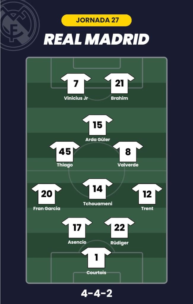 - Real Madrid: Courtois; Trent, Rüdiger, Asencio, Fran García; Tchouaméni, Thiago Pitarch, Valverde, Arda Güler; Brahim Díaz y Vinicius
