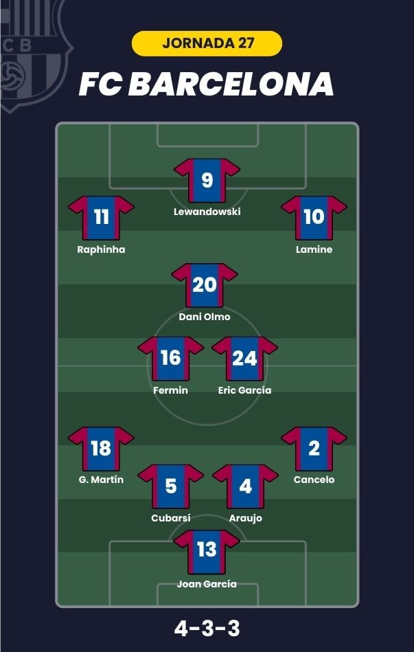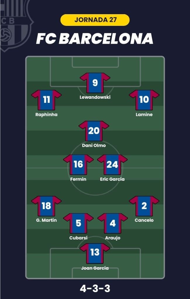- FC Barcelona: Joan García; Cancelo, Cubarsí, Araujo, Gerard Martín; Eric García, Fermín López, Dani Olmo; Lamine Yamal, Raphinha y Lewandowski