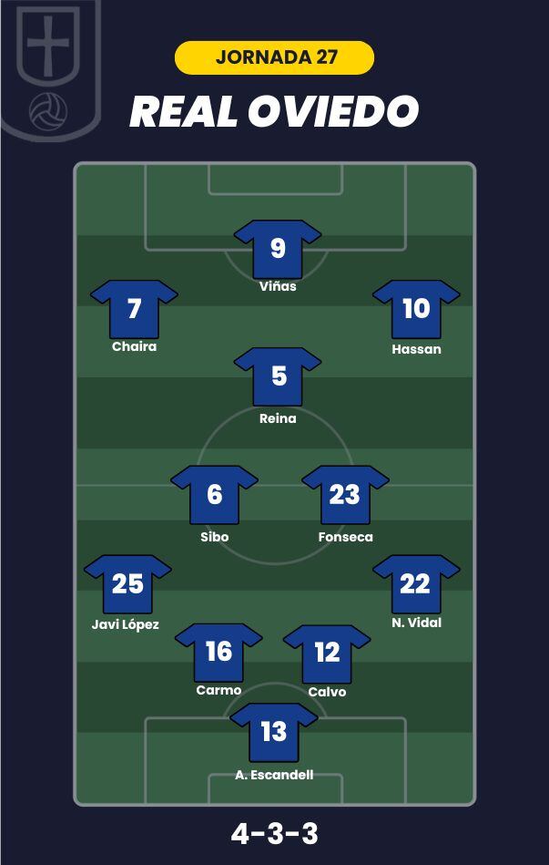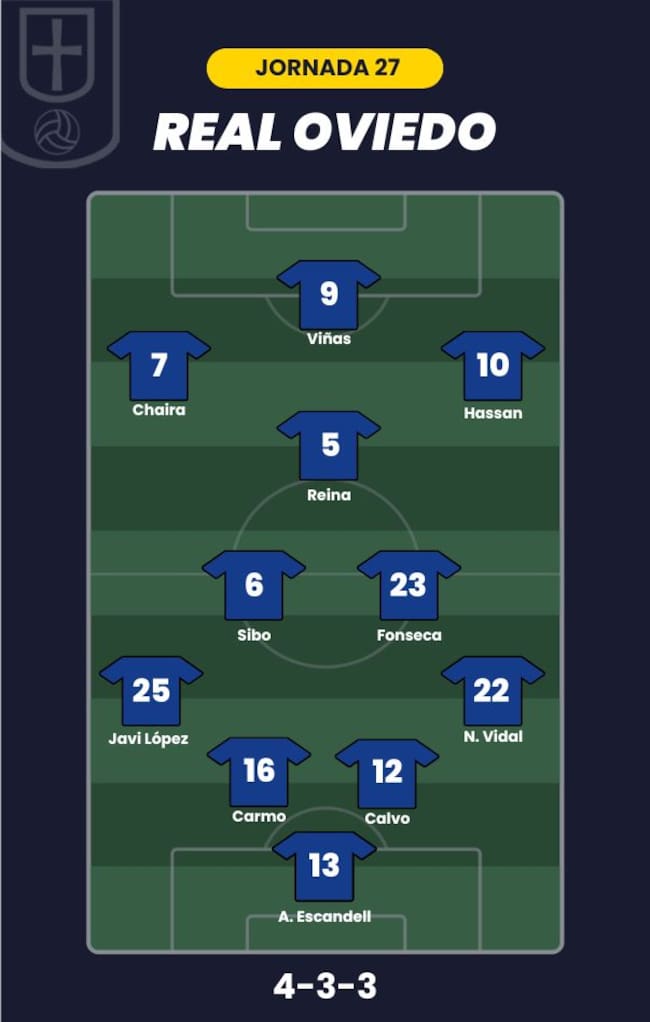 - Real Oviedo: Aarón; Nacho Vidal, Calvo, Carmo, Javi López; Fonseca, Sibo, Reina; Hassan, Chaira y Viñas