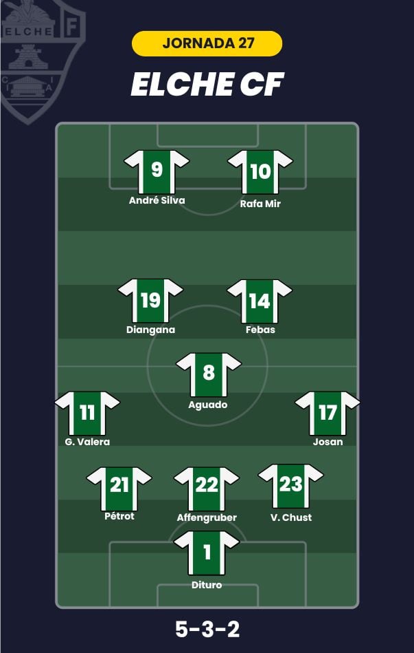 - Elche CF: Dituro; Josan, Víctor Chust, Affengruber, Pétrot, Germán Valera; Aguado, Diangana, Febas; André Silva y Rafa Mir