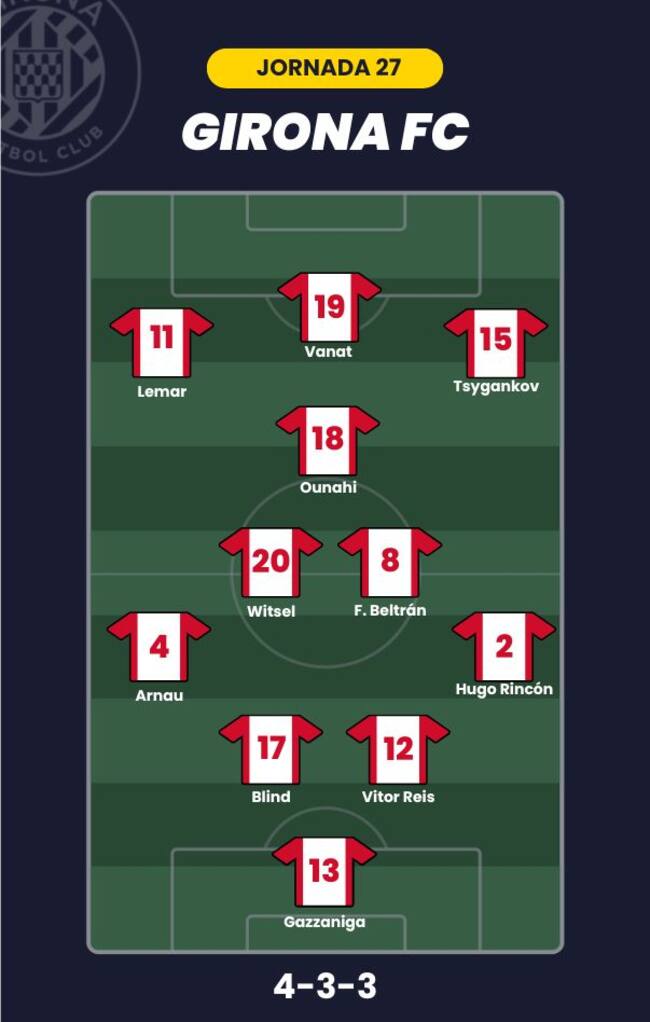 - Girona FC: Gazzaniga; Hugo Rincón, Vitor Reis, Blind, Arnau; Witsel, Fran Beltrán, Ounahi; Tsygankov, Lemar; y Vanat