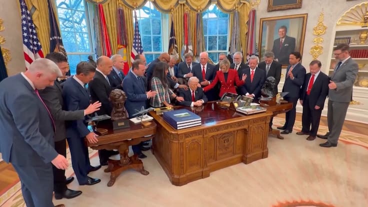 En el encuentro, Trump se sentó en su mesa con los pastores alrededor y rezaron todos juntos, con muchos de ellos tocando al propio presidente, en un nuevo guiño a la religión y el catolicismo por parte de la administración que encabeza el republicano.