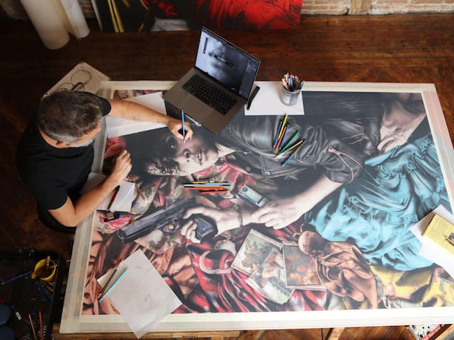 Gabriel Moreno nació en Baena, Córdoba, en 1973 y se ha convertido en los últimos años en uno de los artistas más valorados e influyentes de las últimas décadas. Sus cuadros están presentes en las ferias internacionales de Arte y sus ilustraciones son demandadas por revistas y publicaciones de medio mundo, “Todos dibujamos cuando somos pequeños”, nos explica conversando en su estudio. “La diferencia es que yo no dejé de dibujar y luego, a la hora de elegir una opción para estudiar me matriculé en Bellas Artes. Hice la especialidad de pintura y dibujo y luego la de diseño”, nos cuenta.