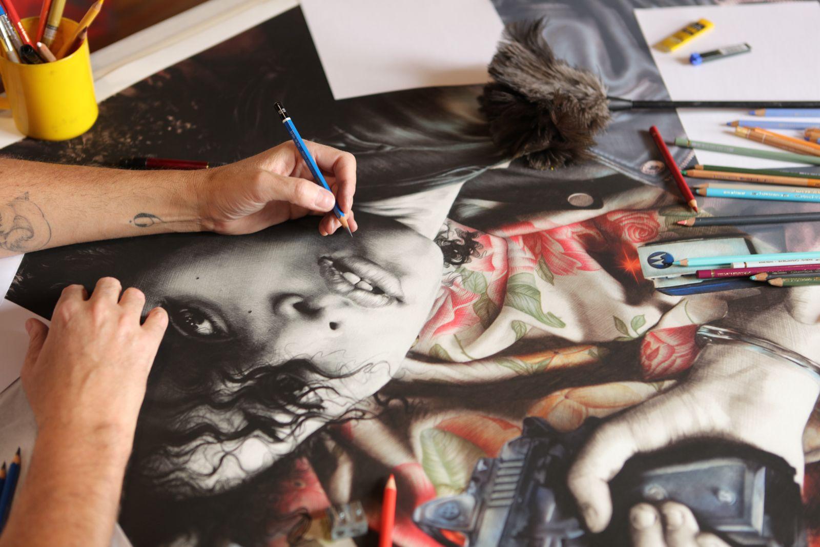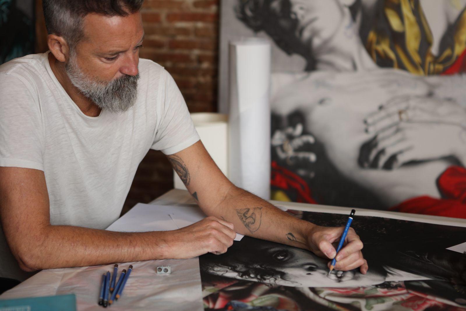 Gabriel Moreno nació en Baena, Córdoba, en 1973 y se ha convertido en los últimos años en uno de los artistas más valorados e influyentes de las últimas décadas. Sus cuadros están presentes en las ferias internacionales de Arte y sus ilustraciones son demandadas por revistas y publicaciones de medio mundo, “Todos dibujamos cuando somos pequeños”, nos explica conversando en su estudio. “La diferencia es que yo no dejé de dibujar y luego, a la hora de elegir una opción para estudiar me matriculé en Bellas Artes. Hice la especialidad de pintura y dibujo y luego la de diseño”, nos cuenta.