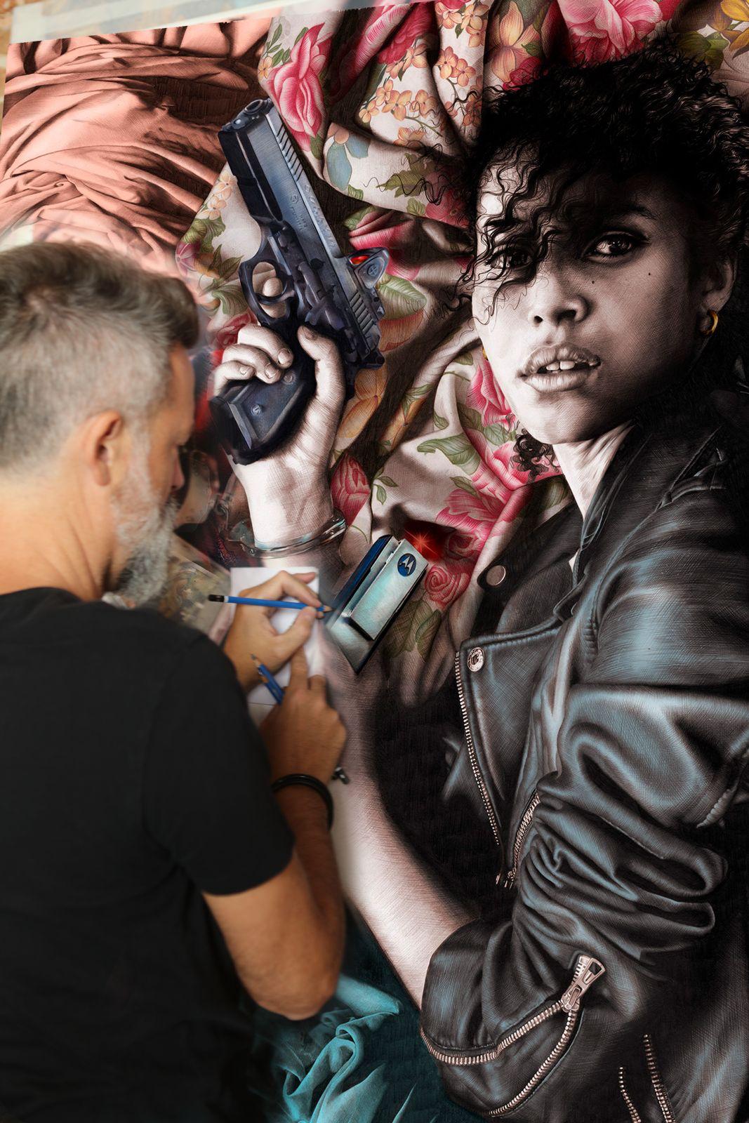 Lo primero que sorprendió a Gabriel Moreno es que en su cartel no tenían que aparecer Leonardo DiCaprio, el protagonista del film, ni tampoco Sean Penn ni Benicio del Toro, los actores secundarios y estrellas internacionales sino Chase Infinity, la joven actriz que debutaba en el mundo del cine. “Para PTA ella es la protagonista. La película va de esa niña que nace en unas determinadas circunstancias y va forjando un carácter fuerte. Paul Thomas Anderson me decía que me había buscado a mí por cómo yo dibujo a las mujeres”, explica el pintor. “Tenía que transmitir su dulzura, pero también su fuerza. Hicimos varios bocetos en los que se incluía la cara de Leonardo DiCaprio, pero no funcionaba. Al principio fue difícil. Me llamaron en junio del 2025 y el cartel definitivo se aprobó en septiembre. Mandaba una serie de opciones a través de la agencia y PTA contestaba: me gusta la número 6, pero yo confío en el criterio de Gabriel. Que él elija. A partir de ese momento todo fue bien. El cartel le gustó muchísimo. Empezaron a colgarlo en edificios y comenzó a hacerse una gran bola de nieve”.