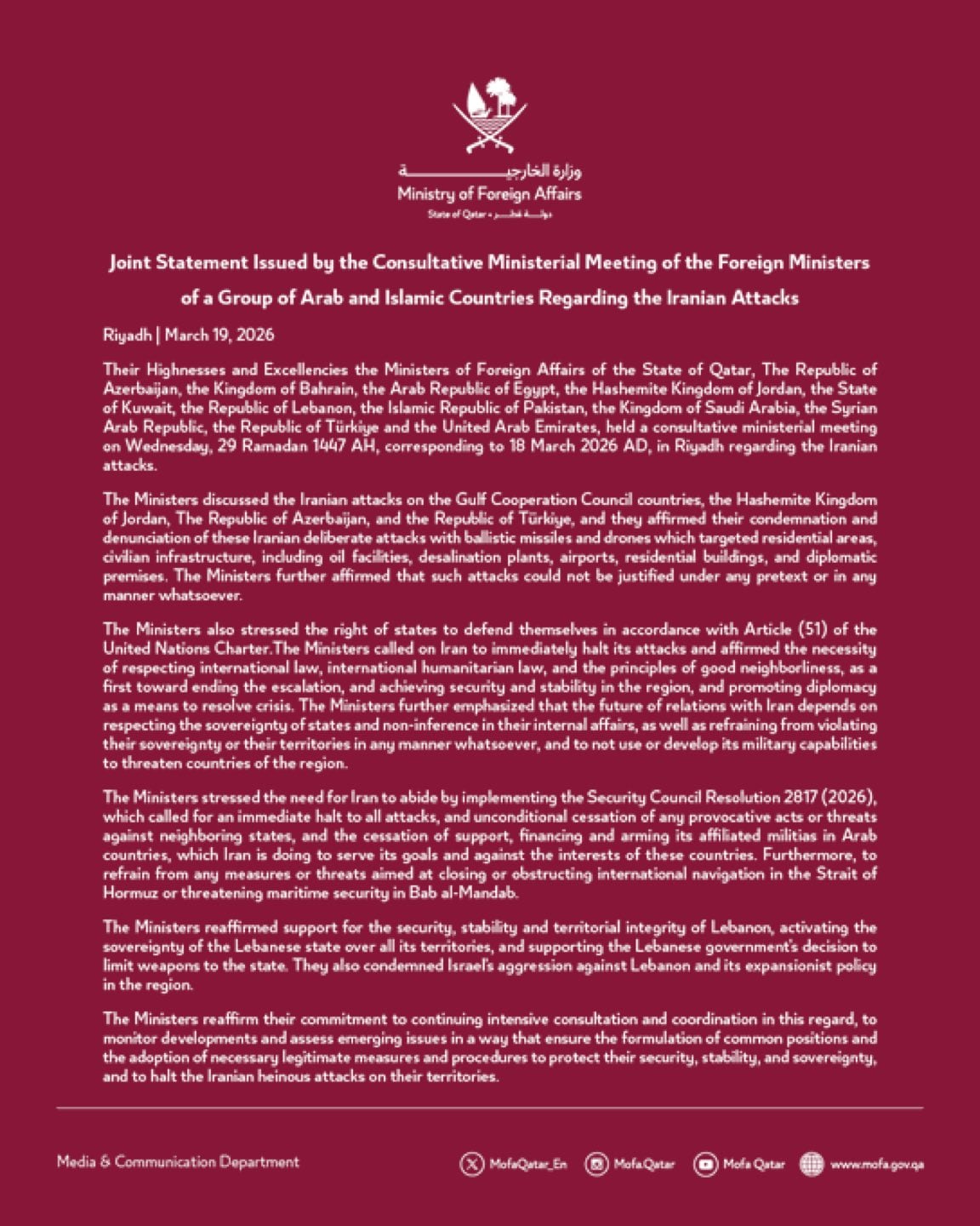 Los firmantes acusan a Irán también de favorecer a milicias que operan "contra los intereses" de la mayoría de países de la zona. Los países que se suman al comunicado conjunto son Azerbaiyán, Bahréin, Catar, Egipto, Jordania, Kuwait, Líbano, Pakistán, Arabia Saudí, Siria, Turquía y los Emiratos Árabes.