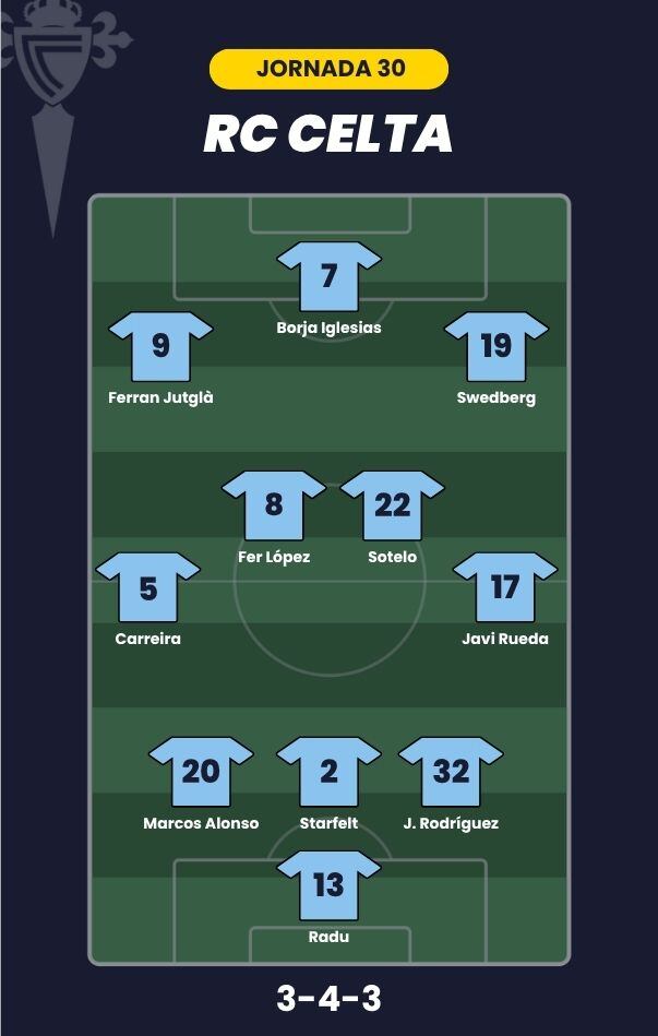 - Celta de Vigo: Radu, Javi Rueda, Javi Rodríguez, Starfelt, Marcos Alonso, Carreira; Sotelo, Fer López; Ferran Jutglà, Swedberg y Borja Iglesias