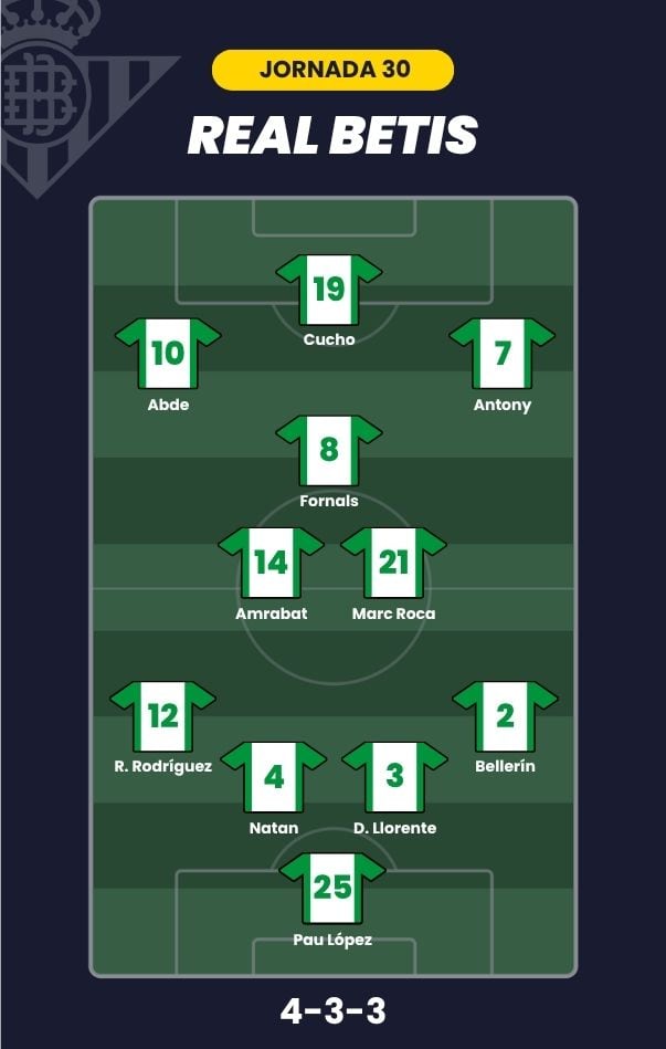 - Real Betis: Valles; Bellerín, Llorente, Natan, Ricardo Rodríguez; Marc Roca, Fornals, Amrabat; Antony, Abde y Cucho Hernández