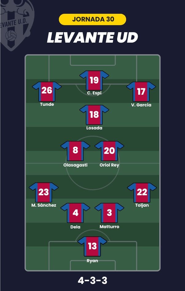 - Levante UD: Ryan; Toljan, Dela, Matturro, Manu Sánchez; Olasagasti, Oriol Rey, Losada; Víctor García, Tunde y Carlos Espí