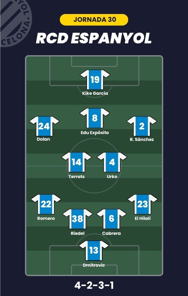 - RCD Espanyol: Dmitrovic; El Hilali, Riedel, Cabrera, Romero; Urko, Terrats, Edu Expósito; Rubén Sánchez, Dolan y Kike García