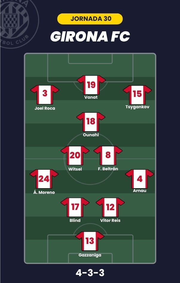 - Girona FC: Gazzaniga; Arnau Martínez, Vitor Reis, Blind, Álex Moreno; Witsel, Fran Beltrán, Ounahi; Tsygankov, Joel Roca; y Vanat