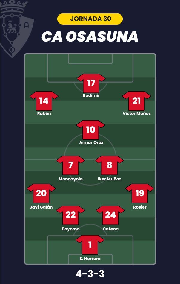 - CA Osasuna: Herrera; Rosier, Catena, Boyomo, Javi Galán; Moncayola, Iker Muñoz, Aimar Oroz; Rubén García, Víctor Muñoz y Budimir